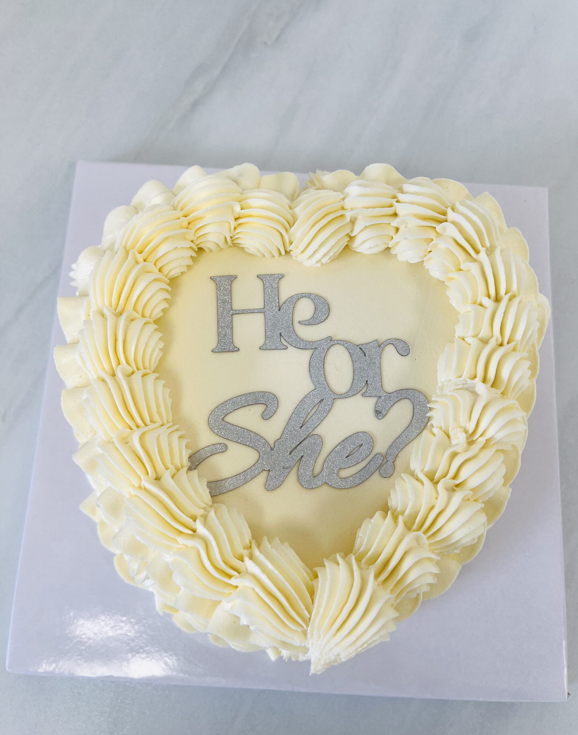 A beautifully decorated gender reveal cake, finished with elegant piping around the sides and top. The real surprise is the centre – when the cake is cut, the piping in the middle reveals the baby’s gender with a hidden burst of colour, either soft pink or baby blue. A timeless classic with a touch of nostalgia! Choose your preferred, flavours and personalised message to make it truly unique! Indulge in the sweetness of our heart-shaped cake. Made with premium ingredients and a whole lot of love. Share the joy and love with a slice of our delectable heart cake today.