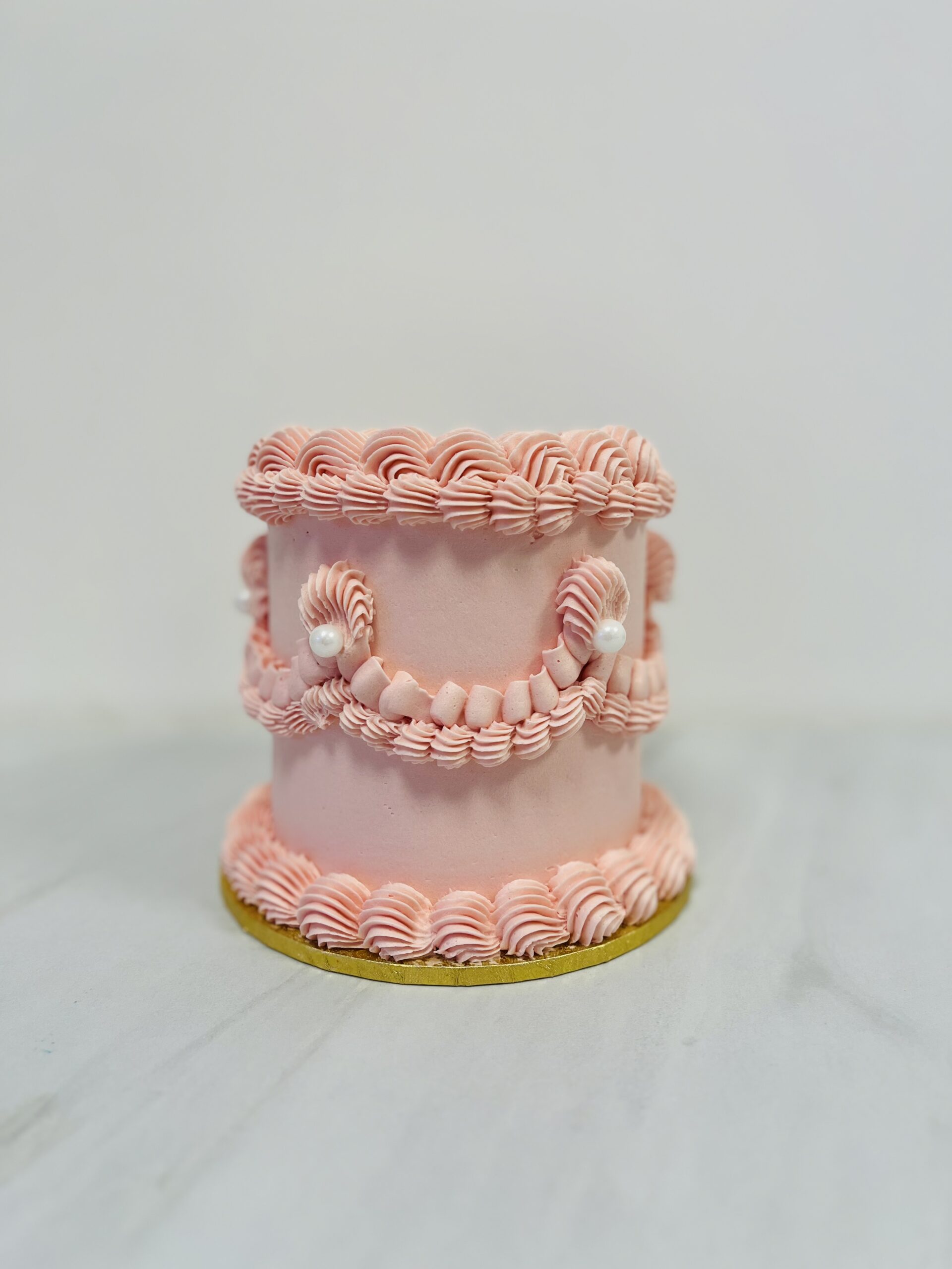Classic elegance meets vintage charm with our Vintage-Inspired Retro Cake. Decorated with delicate piped swirls, ruffles, and pearls. Perfect for special occasions add a touch of romance making it an ideal centrepiece. This beautifully crafted cake features making it a timeless choice for any celebration. Customise it with your favourite flavours and filings for a truly unforgettable treat!