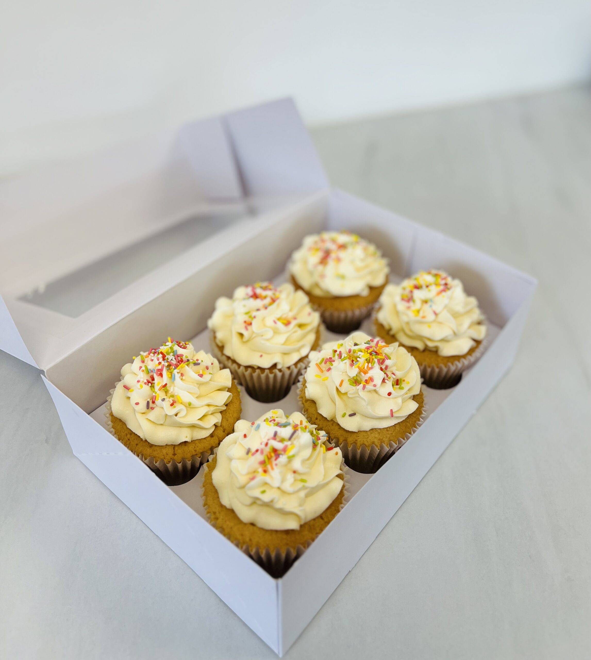 Vanilla cupcakes with coloured sprinkles. Perfect to enjoy as a treat or for a celebration.