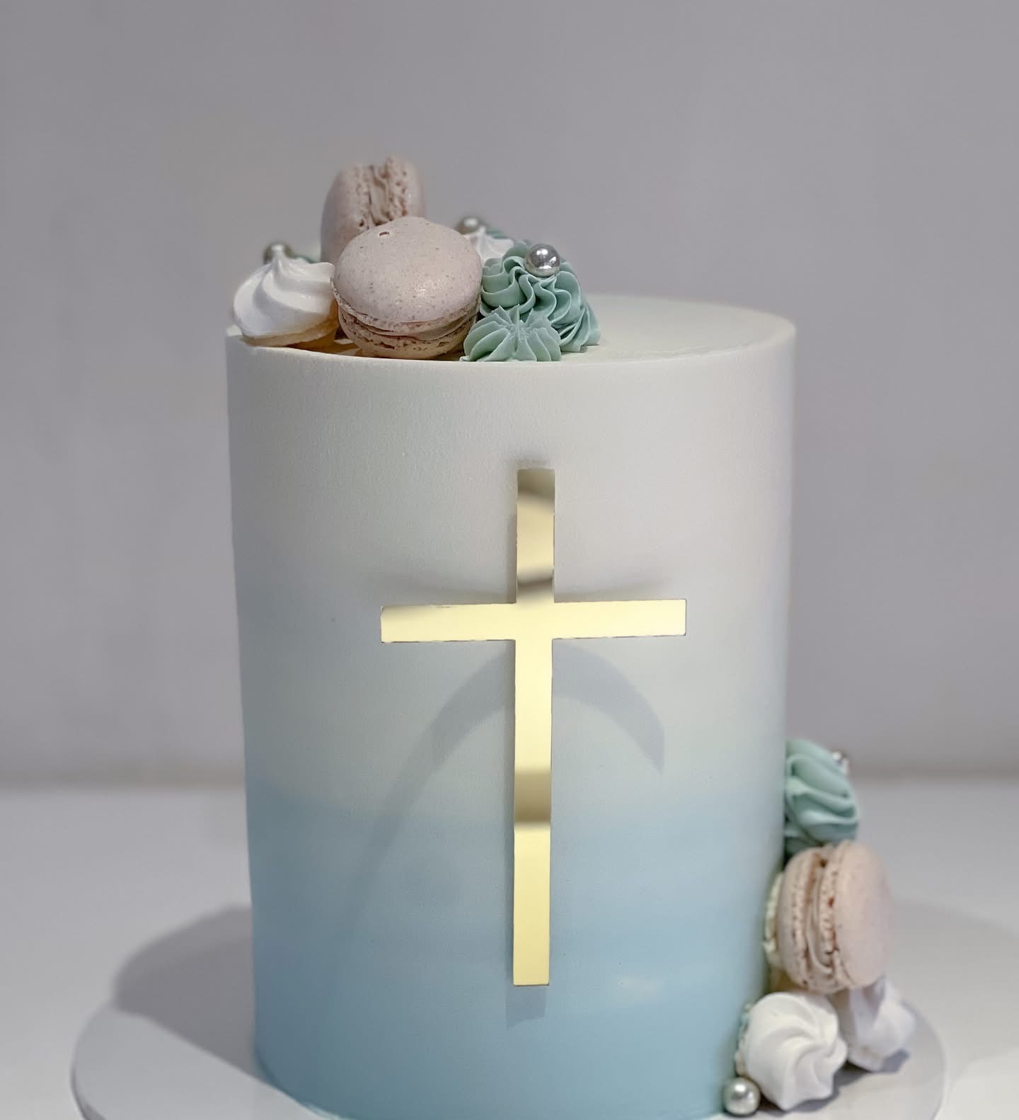 A  graceful Ombré Cake beautifully designed with a soft gradient buttercream finish, and a cross topper. A timeless choice for any religious celebrations.