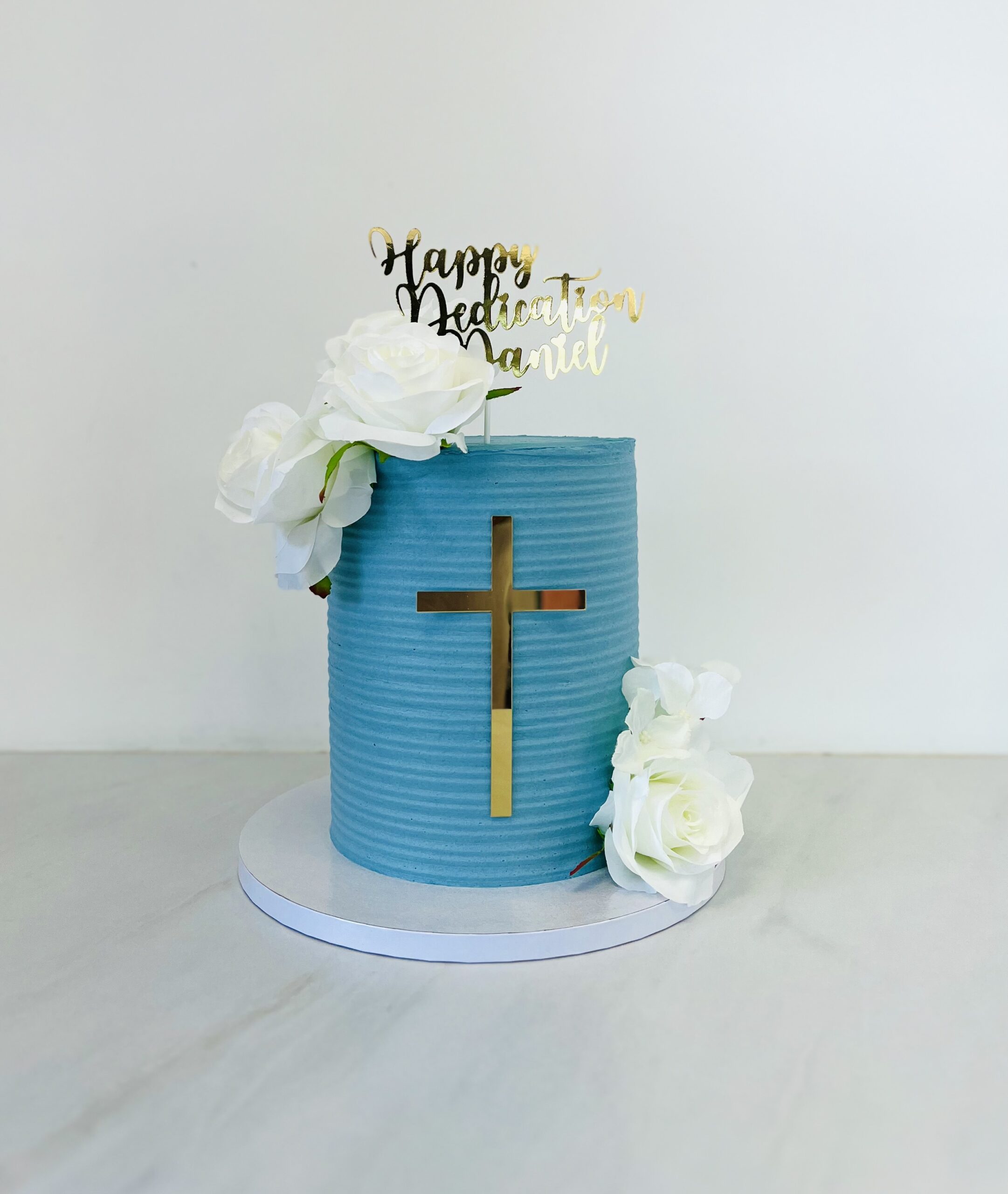 A textured floral cake beautifully designed with a soft gradient buttercream finish, and a cross topper. A timeless choice for any religious celebrations.